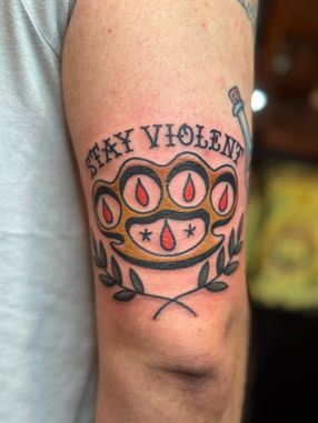 Meet Wesley king, a passionate and hardworking second-year apprentice, currently under the guidance of Mac. he has lived in ardmore all his life, and has been employed with michelin as a tire builder for the last 12 years. he is A lifelong artist at heart, , and embraces all different art forms—whether it's wood carving, coffee roasting, painting, or sculpting. he’s thrilled to be able to express his creativity through a new medium: skin! his style draws inspiration from the rich history of American traditional works. he hand paints his own flash sheets, has a plethora of classic flash books you can look through, or he is always open for custom projects as well. Wesley is open for scheduling and eager to get you in his chair for a tattoo experience you will cherish forever.